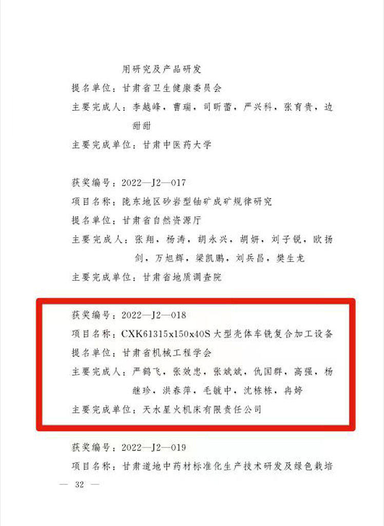 日前,甘肅省人民政府對在我省科學技術進步、經(jīng)濟社會發(fā)展中作出突出貢獻的科學技術人員和組織進行了評審獎勵。由星火機床集團公司機床研究院科研人員嚴鶴飛、張效忠、張斌斌、仇國群、高強、楊繼珍、洪春萍、毛毓中、沈棟棟、冉婷研發(fā)的CXK61315x150x40S大型殼體車銑復合加工設備榮獲甘肅省科學技術進步獎二等獎。