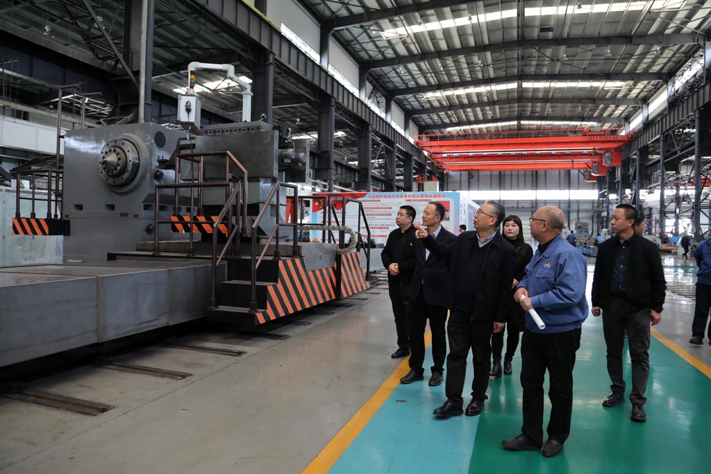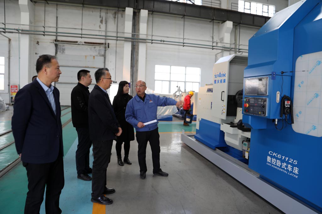 在星火機床公司工業園裝配及青重公司生產現場,蔣俊向李長迅一行詳細介紹了企業的生產經營、產品研發、技術創新以及人才培養等情況,以及五軸聯動車銑復合加工中心、長軸機床、車輪車床等產品的性能、用途和市場前景等。