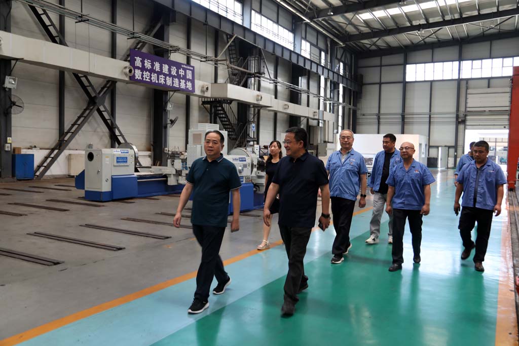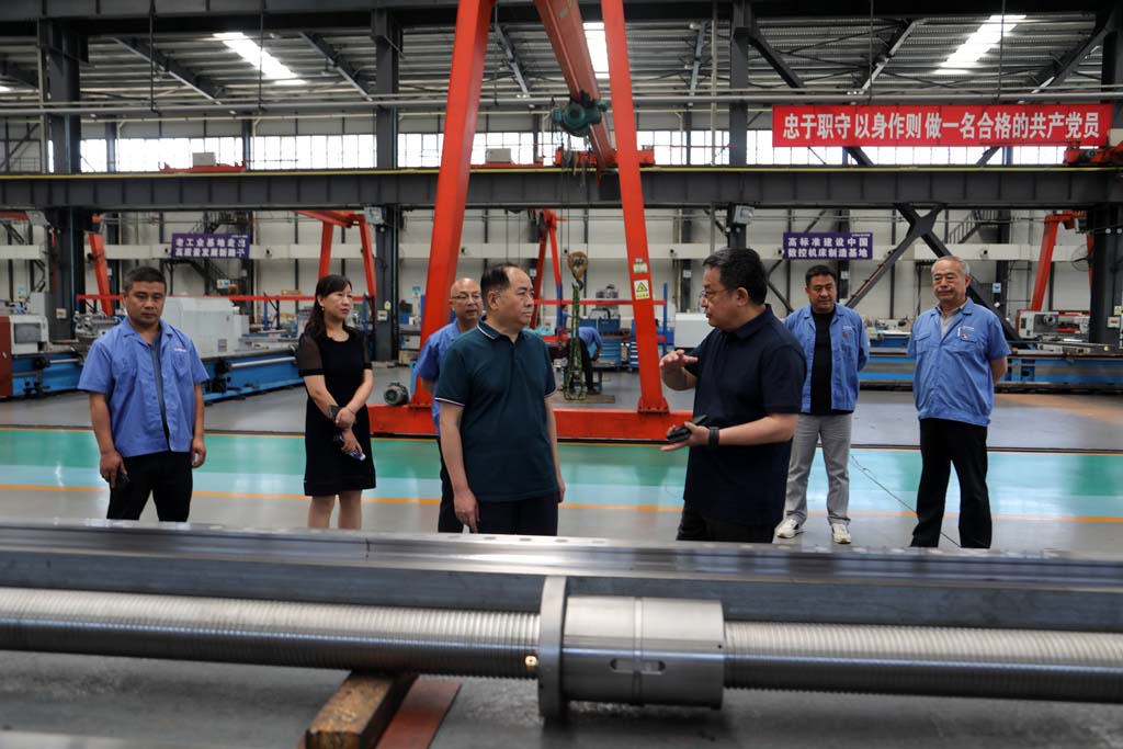 梅學千一行在蔣保權陪同下參觀了工業園裝配車間、青重加工車間以及噴漆車間,蔣保權向梅學千介紹了車間生產裝配中的長軸車床、車輪車床以及五軸聯動機床等典型設備,并就產品的國產化率以及產品涉及的材料技術、制造技術等細節問題進行了溝通交流。