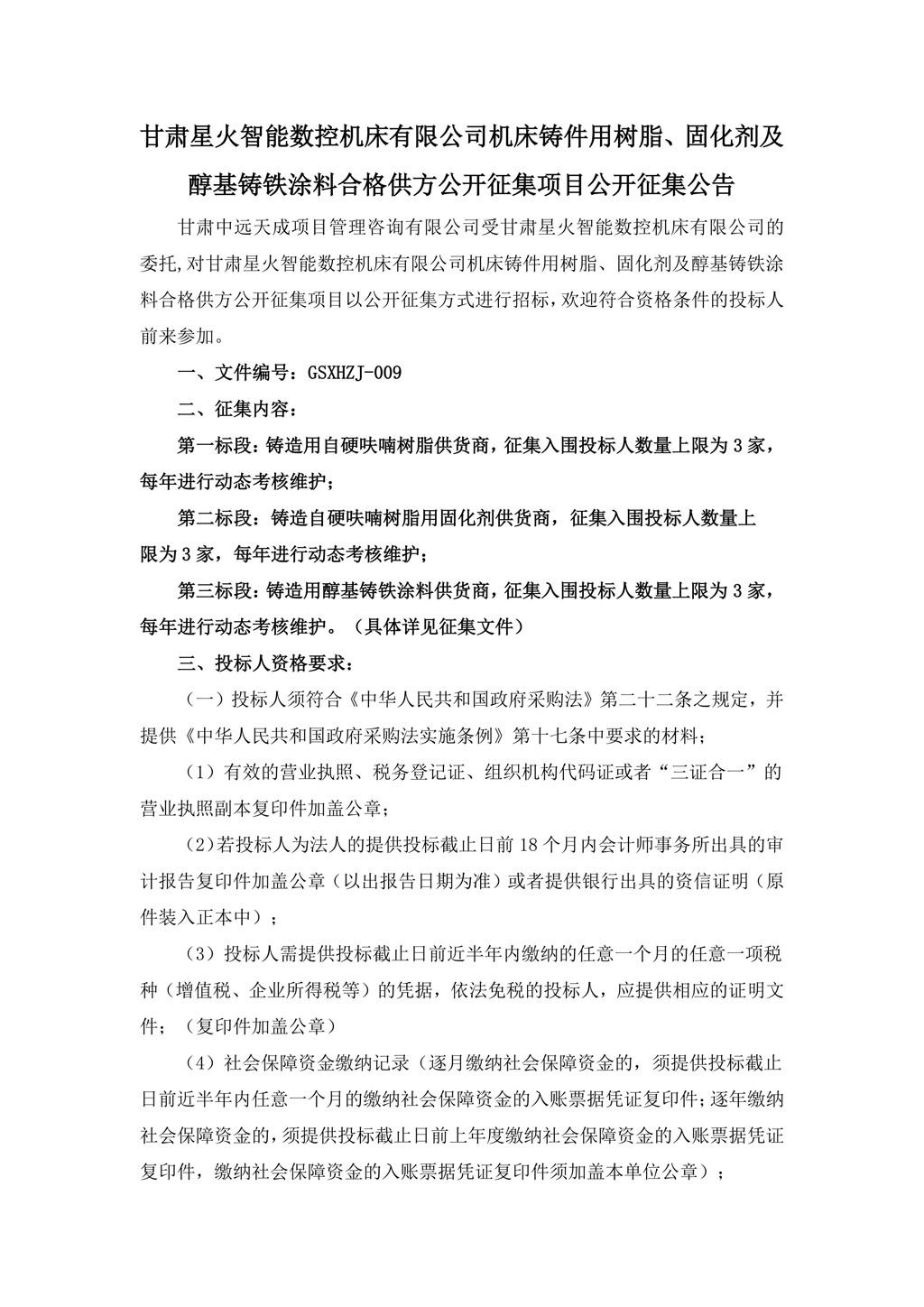 甘肅星火智能數控機床有限公司機床鑄件用樹脂、固化劑及醇基鑄鐵涂料合格供方公開征集項目公開征集公告