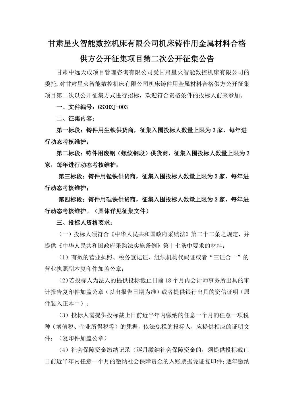 甘肅星火智能數(shù)控機床有限公司機床鑄件用金屬材料合格供方公開征集項目第二次公開征集公告